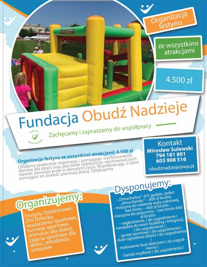 Szukasz pomysłu na zorganizowanie festynu, dni sąsiadów czy spotkania dla pracowników? Fundacja „Obudź Nadzieję” zrobi to za Ciebie! Naszą misją jest praca na rzecz integracji społecznej, dlatego współpraca z nami to wiele korzyści. Nasze stawki za organizację imprezy są jednymi z najatrakcyjniejszych w Trójmieście! Jesteśmy profesjonalistami z dużym doświadczeniem i niespożytą pozytywną energią. Ale przede wszystkim korzystając z naszej usługi dajesz pierwszą pracę wychowankom domów dziecka i placówek opiekuńczo – wychowawczych. Na integracji znamy się jak mało kto. Zapraszamy do współpracy!